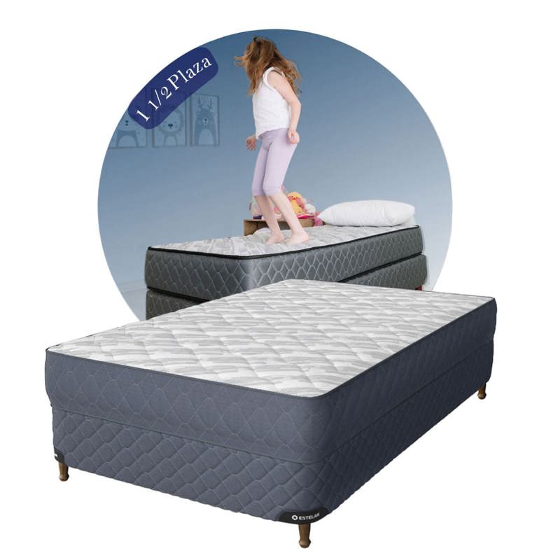 Colchón de 1 1/2 plaza fabricado con espuma de alta densidad y tela jackard matelaseada, que ofrece un soporte firme y duradero. Su tratamiento antialérgico y antibacteriano garantiza un descanso saludable y seguro.