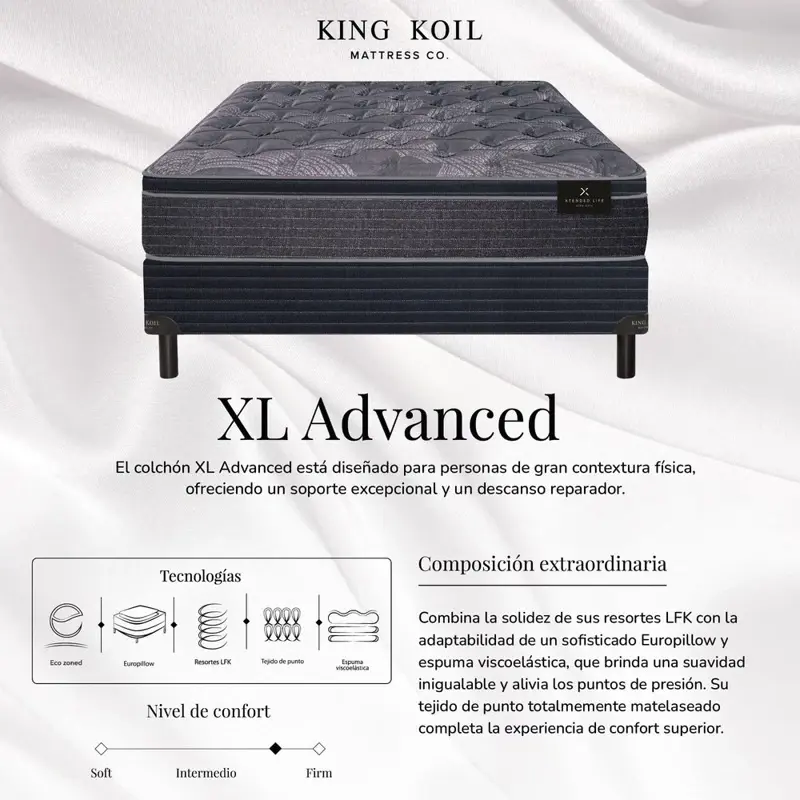 El colchón XL Advanced de King Koil aporta beneficios exclusivos para personas de gran contextura física.En World Extended Life se triplica la capacidad de soporte a partir de la estructura de resortes de mayor resistencia del mercado: LFK. Además este moderno producto incorpora una capa de espuma Eco Zoned, sustentable y de gran densidad, logrando así una máxima durabilidad y un compromiso con el medio ambiente.Su destacado europillow y la superficie en tejido de punto le aportan más confort y suavidad desde el primer contacto.Este modelo cuenta con una resistente base de Sommier World Luxury.