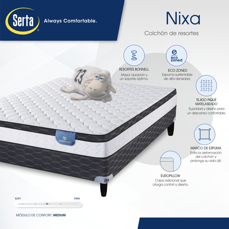 El sommier y colchón de resortes Nixa Queen Size de Serta es un producto innovador y sustentable, gracias a la incorporación de la espuma ecológica Eco Zoned, que combinada con una estructura de resortes bonnell brindan el soporte justo.