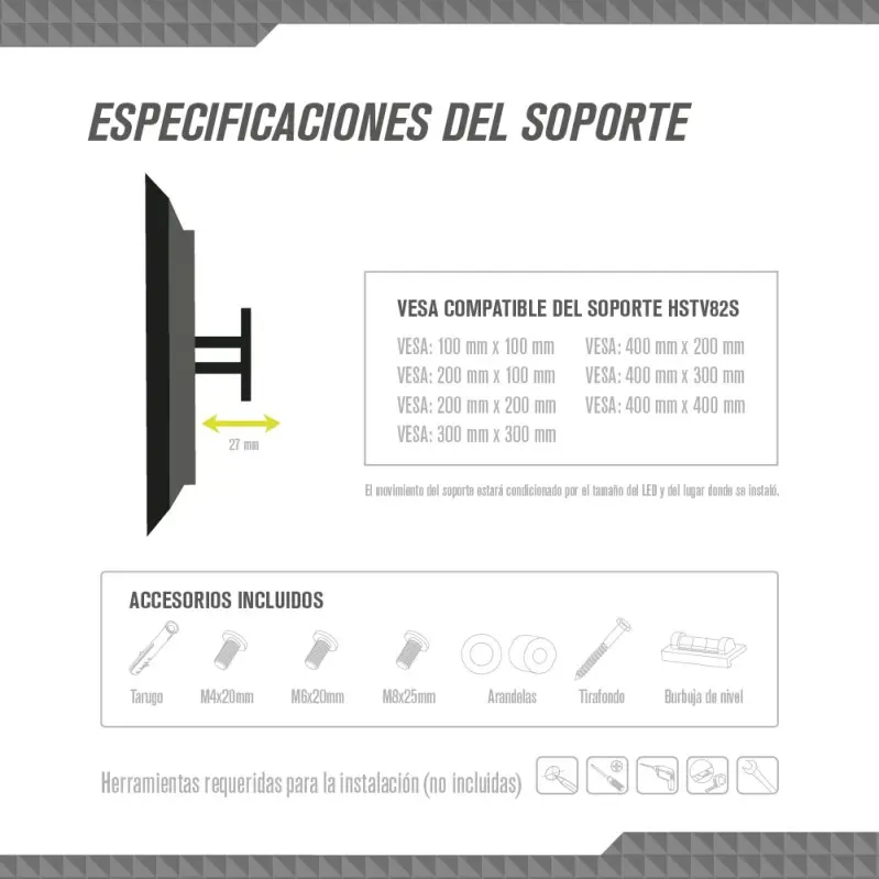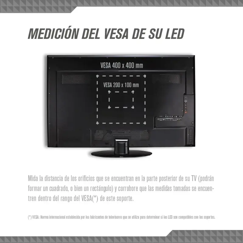 Todas las posibilidades en un solo elemento. Con este soporte podrás colocar cualquier TV LCD/LED que este en el rango de entre 26" y 60". Para tener en cuenta antes de comprarlo, medida VESA es de 400x400 mm, por lo que hay que corroborar que tu TV se encuentre dentro de estas medidas.