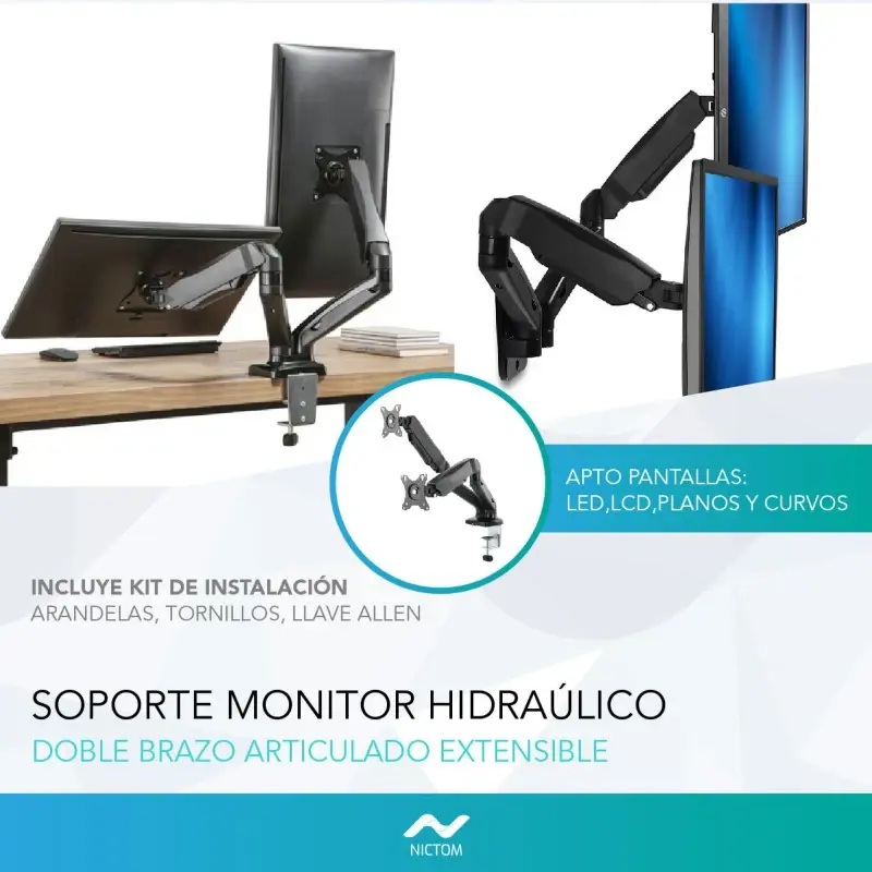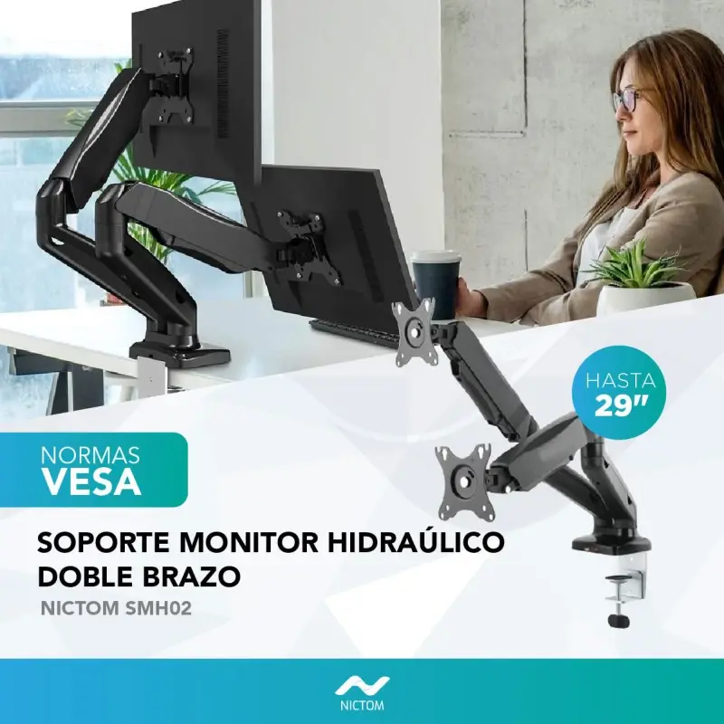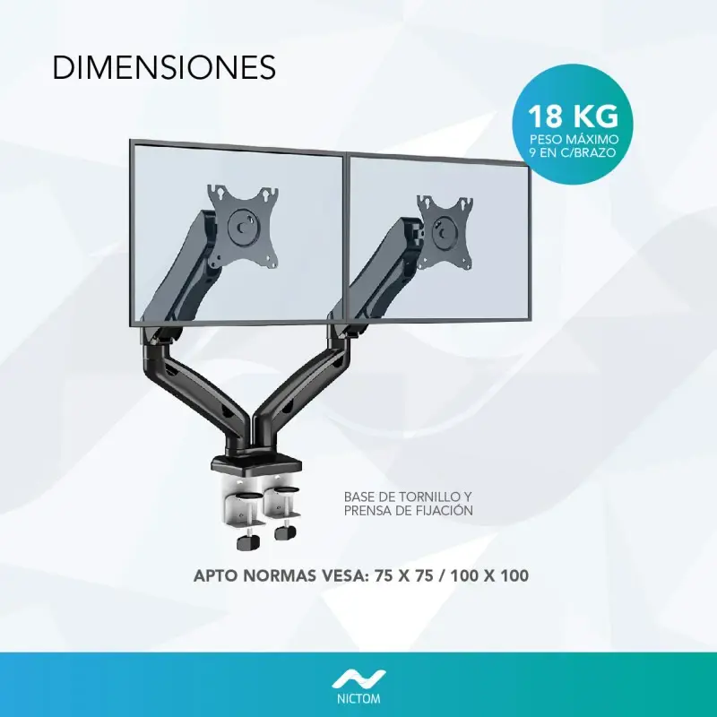 Nictom Tienda OficialDescripción:Este soporte para LED y monitor doble cuenta con brazos interactivos para mover sin esfuerzo los monitores en varias direcciones pudiendo colocarlos en diferentes configuraciones. Vas a poder bajar o subir tu pantalla para verla desde una posición sentado o parado, esto te va a ayudar a reducir la tensión en ojos, cuello y espalda, garantizando un mayor confort.Características:Para pantallas de 13” a 29”Cantidad de pantallas soportadas: 2Peso Máximo: 18 KgLugar de montaje: mesaVESA: 75×75, 100×100InclinableGiratorioArticuladoInclinación superior: 45°Inclinación inferior: 45°Ángulo de rotación: 360°Soporte fuerte y resistentePintura de máxima protecciónBrazos articulados, flexibles y resistentesFácil de armar y de instalar en cualquier mesa o escritorioSoporte para monitor con resistente base y brazos reforzadosSumamente robusto, elaborado con acero y materiales de primera calidadDe altura ajustableIncluye kit de instalaciónImportante: Verifique que su LED sea compatible con las normas de VESA de este soporte