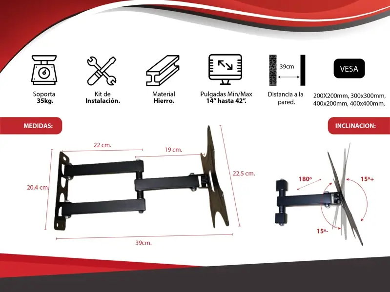 Este soporte es la solución ideal para quienes buscan optimizar el espacio y mejorar la experiencia visual en su hogar.Diseñado para pantallas de entre 14 a 42 pulgadas, este soporte articulado permite una inclinación de hasta 15 grados, adaptándose a tus necesidades de visualización y garantizando una comodidad excepcional.Fabricado en acero, este soporte es capaz de soportar hasta 35 kg, asegurando la estabilidad de tu monitor. Su diseño en color negro se integra perfectamente en cualquier decoración, aportando un toque moderno y elegante a tu sala de estar o dormitorio.Instalado en la pared, el soporte ofrece una distancia máxima de 39 cms permitiendo un ajuste flexible según el espacio disponible.Compatible con pantallas Monitor LED, LCD y Plasma, este soporte es una opción versátil para cualquier hogar.CARACTERÍSTICAS Carga máxima soportada 35 kg Para pantallas de 14- 42 Distancia a la pared máxima 39 cm. Inclinacion de 15 a- 15 Vesa 200x200- 300x300- 400x200- 400x400. Fácil y rápida instalación. Incluye manual de usuario y kit de instalacion de regalo Soporte fuerte y resistente. Fabricado en metal negro invisible al usarlo una vez instalado. Hecho con acero de alta calidad. Producto Nuevo en CajaGarantía del vendedor 6 meses