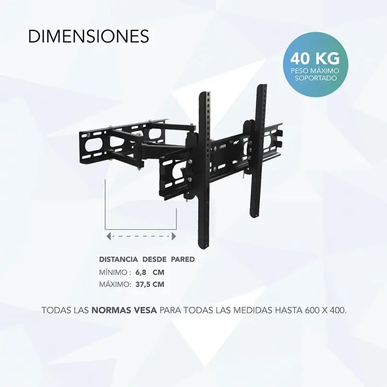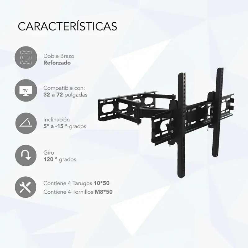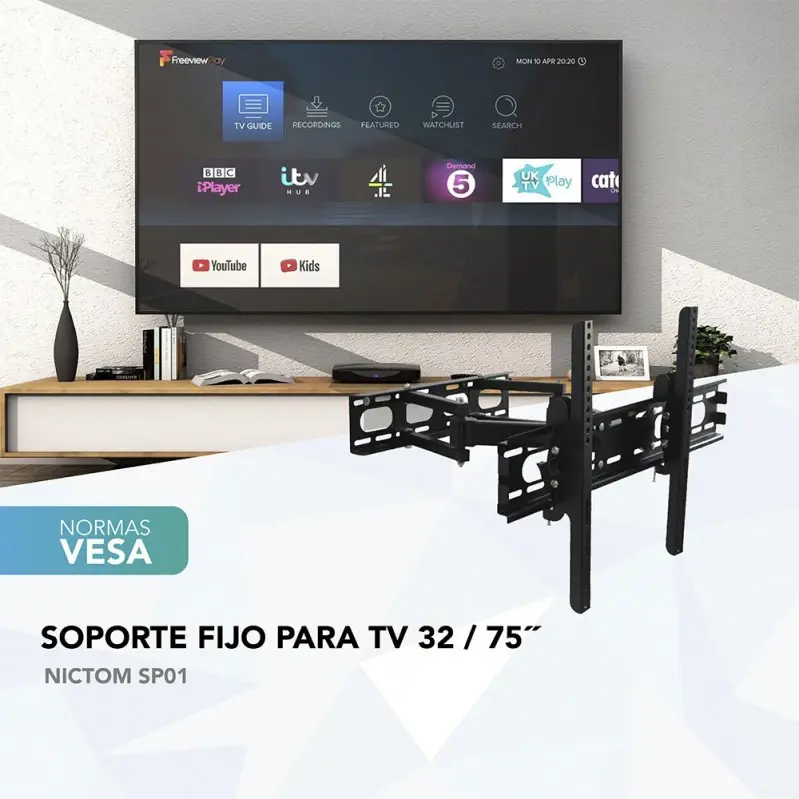 Nictom Tienda OficialDescripción:Los soportes Nictom son diseñados para una excelente funcionalidad y resistencia gracias a su Doble Brazo Reforzado, haciéndolos los más confiables del mercado.Características:Este soporte es Compatible con televisores que van desde 32 a 75 pulgadas y con todas las normas VESA para todas las medidas hasta 600 x 400.Soporte móvil de doble brazo reforzado dándole mayor firmeza y seguridad a su TV.Inclinación de 10° a- 5°Giro de 180°Distancia del TV a la pared de 110 a 485mm