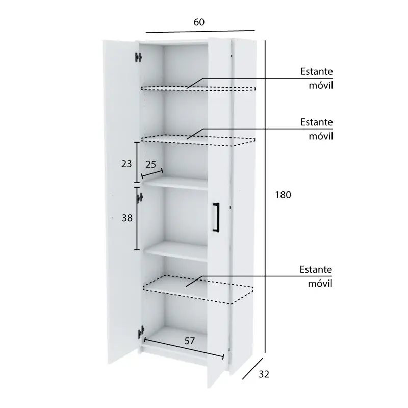 MUEBLE ORGANIZADOR DESPENSERO MAXI CON ESTANTES- Centro Estant Modelo: DIS4BL MATERIALIDAD Nuestros productos están desarrollados a partir de placas de aglomerado melaminizado proveniente de árboles de reforestación. La melamina brinda una gran protección contra el deterioro, evita ralladuras, la abrasión y prolonga la vida útil de nuestros productos. PRESENTACIÓN Nuestros productos se entregan desarmados en cajas de cartón corrugado de alta resistencia, cubiertas con un film termocontraíble que las protege del deterioro ocasionado por el traslado. En su interior cuentan con las piezas y herrajes necesarios para armar los muebles. Características • 6 Estantes • 2 Puertas • Revestido en melamina • Manijas aluminizadas • Bisagras reforzadas • 4 Posiciones de encastre • Medidas producto: 1.80 mts x 60 cm x 32 cm • Medidas embalaje: 185 x 31 x 12 cm • Peso: 36 Kg *Las imágenes son de carácter ilustrativo* **************************************************************************************************************************************************************** 72hs de prueba con nosotros GARANTIA DE 12 MESES CON LA MARCA