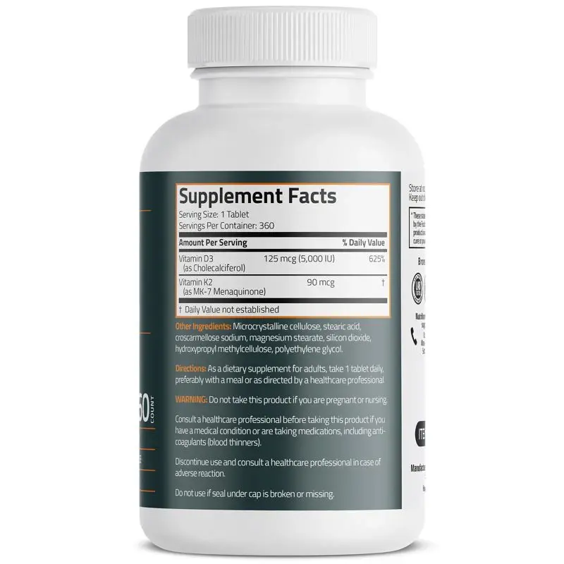 - Alta calidad y excelente relación calidad-precio: la vitamina K2 + D3 de Bronson Basics proporciona 90 mcg de vitamina K2 en forma de MK-7 y 5000 UI de vitamina D3 por comprimido en una botella de suministro para 1 año. Nos esforzamos por apoyar su buena salud y bienestar a través de suplementos de alta calidad al mejor precio.