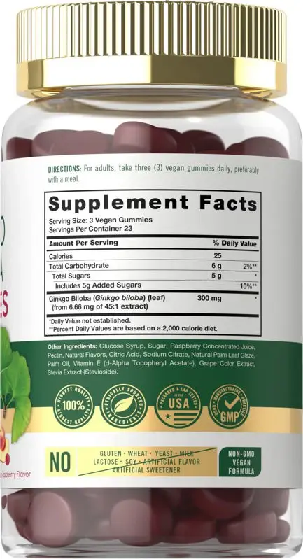 ¿Qué es el Ginkgo Biloba? El ginkgo biloba es una hierba tradicional originaria de China que se ha utilizado durante siglos en las prácticas de bienestar tradicionales. Este árbol a veces se denomina pelo de doncella porque tiene hojas que se parecen precisamente a eso. Las semillas del Ginkgo Biloba, que también son populares en las culturas asiáticas actuales, suelen cocinarse y servirse como guarnición, mientras que las hojas secas de la planta se convierten en té. Ginkgo Biloba de Carlyle: las gomitas de Ginkgo Biloba de Carlyle brindan una explosión de delicioso sabor a fruta natural y nutrientes clave de origen natural que respaldan su estilo de vida. Elaboradas con los mejores ingredientes, cada porción ofrece el equivalente a 300 mg de Ginkgo Biloba. Nuestra fórmula vegana está hecha sin saborizantes ni edulcorantes artificiales, ¡lo que la convierte en un suplemento de apoyo popular para hombres y mujeres de todo el mundo! Arraigados en el bienestar: nuestra experiencia en el suministro de los ingredientes más puros, combinada con tecnologías avanzadas, nos enorgullece ofrecer suplementos honestos y de primera calidad al mejor precio. Nuestro suplemento herbal Gingko Biloba es un testimonio de nuestro compromiso con la excelencia, elaborado con ingredientes poderosos basados en el bienestar. ¡Gracias por elegirnos en tu búsqueda de una vida saludable! ADVERTENCIA: No debe ser utilizado por mujeres embarazadas o en período de lactancia ni por personas menores de 18 años. Si está tomando algún medicamento, incluidos anticoagulantes, planifica algún procedimiento médico o quirúrgico o tiene alguna afección médica, consulte a su médico antes de usarlo. Si se produce alguna reacción adversa, deje de usar este producto inmediatamente y consulte a su médico. Si el sello debajo de la tapa está dañado o falta, no lo use. Manténgalo fuera del alcance de los niños. Almacene en un lugar fresco y seco. Evite el calor excesivo.