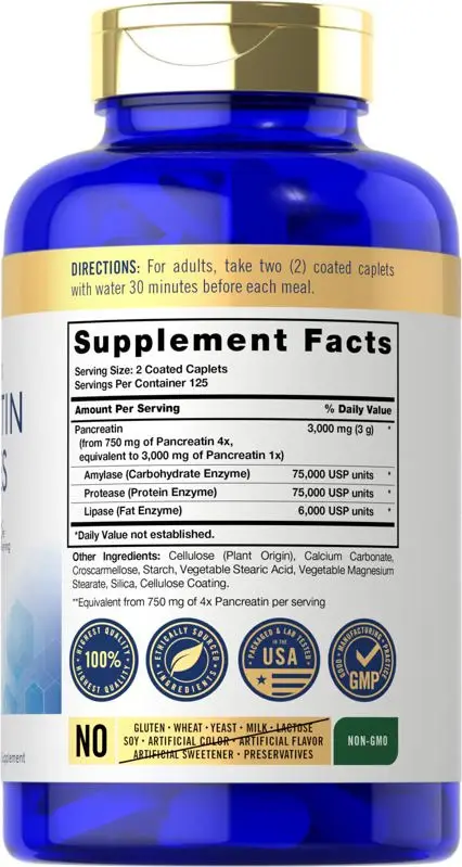 Carlyle UltraStrength Pancreatin Enzymes es el mejor suplemento de enzimas pancreáticas, que contiene pancreatina (equivalente a 3000 mg de pancreatina 1 vez por porción) más amilasa, proteasa y lipasa en una potente mezcla de múltiples enzimas. Nuestra fórmula no contiene gluten, no contiene transgénicos y es fácil de absorber con cápsulas recubiertas diariamente.