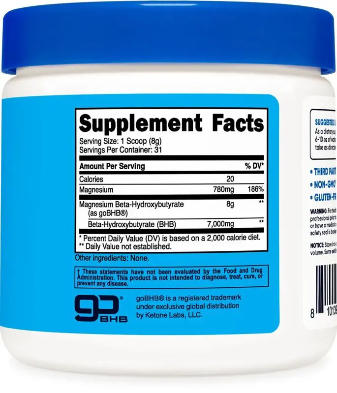 Nutricost La sal de cetona de magnesio contiene 0.23 oz de beta-hidroxibutirato (BHB) por porción. Recomendamos tomar 2 porciones al día durante el período de adaptación a la grasa/cetoadaptación. Una vez establecida la cetosis, continúe tomando 2 porciones por día según sea necesario.