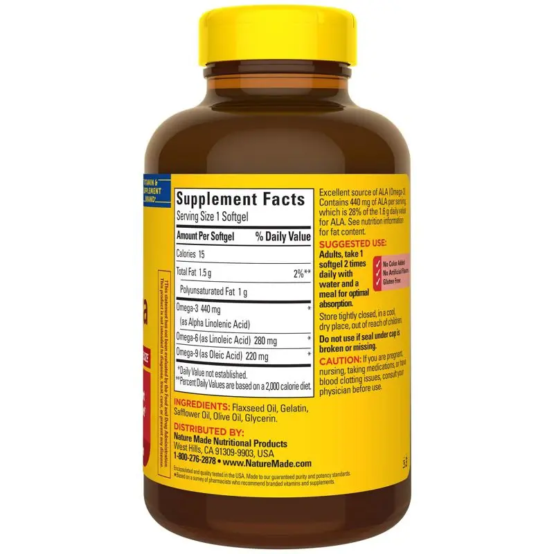 Del fabricante Ver capsulas blandas Nature Made Triple Omega mas grandes, 150 unidades Confie en la salud de su corazon con Nature Made Triple Omega, una formula equilibrada de los tres acidos grasos principales que utiliza el cuerpo (omega 3-6-9). Las investigaciones complementarias, aunque no concluyentes, muestran que el consumo de acidos grasos omega-3 EPA y DHA puede reducir el riesgo de enfermedad coronaria. Los acidos grasos omega-3 tambien ayudan a mantener los niveles de trigliceridos que ya estan dentro del rango normal. †Apoya la salud del corazon†Las investigaciones respaldantes, pero no concluyentes, muestran que el consumo de acidos grasos omega-3 EPA y DHA puede reducir el riesgo de enfermedad coronaria. La capsula blanda One Nature Made Tripe Omega contiene 434 mg de acidos grasos omega-3. Proporciona acidos grasos 3-6-9 en una capsula blanda. Ademas del acido graso omega-3 en forma de EPA y DHA, el Triple Omega de Nature Made contiene otros acidos grasos omega. Los acidos grasos omega-3 y omega-6 son nutrientes que nuestro cuerpo necesita, pero no se producen internamente y, por lo tanto, deben obtenerse de la dieta o la suplementacion. Apoya la funcion celular†Los omega-3 son fundamentales para la salud y respaldan la integridad estructural de las membranas celulares. Se incorporan a las membranas celulares y son necesarios para una funcion celular eficaz, un crecimiento normal y un desarrollo adecuado. Nature Made Triple Omega proporciona una excelente fuente de acidos grasos omega 3-69.† ADVERTENCIA* No tome mas de un comprimido al dia, a menos que lo recomiende un profesional de la salud. No utilice este producto a menos que se lo indique un medico si esta embarazada, intentando quedar embarazada, en periodo de lactancia o si esta tomando algun medicamento o tiene alguna enfermedad cronica, como hipertension (presion arterial alta), diabetes o un trastorno endocrino, autoinmunitario, depresivo, hemorragico o convulsivo. No tome melatonina mientras conduce un vehiculo motorizado o maquinaria. No esta destinado a personas menores de 18 años. Ingredientes seguros y de calidad. Todos los productos Nature Made se fabrican de acuerdo con las estrictas normas de buenas practicas de fabricacion. Sus suplementos nutricionales estan hechos de ingredientes cuidadosamente seleccionados de proveedores confiables. Se garantiza que los productos Nature Made cumplen con altos estandares de calidad de pureza y potencia. Cuando tomes las vitaminas que se encuentran detras de esa conocida etiqueta amarilla, debes saber que estas tomando las mejores para tu salud. Este suplemento no contiene sabores, colorantes, conservantes, levadura, almidon ni gluten artificiales. *Segun encuestas del Pharmacy Times de 2006 a 2013. Nature Made Triple Omega de un vistazo Proporciona omegas de 3 a 6 a 9 en una capsula blanda Apoya la funcion celular† Ayuda al cuerpo a establecer un reloj interno para regular el ciclo del sueño†Apoya la salud del corazon†Contenido de la caja150 capsulas blandas Uso sugerido: tome 1 capsula blanda 3 veces al dia con una comida. Precauciones Si esta embarazada o amamantando, o tomando medicamentos, se enfrenta a una cirugia si tiene problemas de sangrado, si se somete a cualquier otro tratamiento que pueda afectar la capacidad de coagulacion de la sangre, consulte a su medico antes de tomar este producto . Descripcion del producto Llevate a casa este trio de omegas que ayudan a mantener un corazon sano con Triple Omega 3-6-9 de Nature Made. Este suplemento especial de omega 3 (1) de Nature Made con omegas 6 y 9 combina los acidos grasos omega de los aceites de pescado, linaza, cartamo y oliva, en un suplemento saludable para el corazon. Nature Made apoya a los principales expertos en salud cardiaca que recomiendan consumir al menos dos porciones de pescado graso por semana. Porque la calidad es importante, todos los productos de aceite de pescado de Nature Made provienen de peces marinos capturados en estado sa