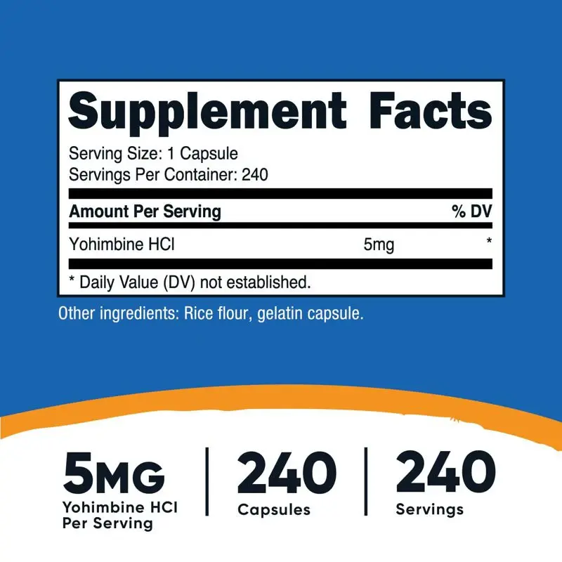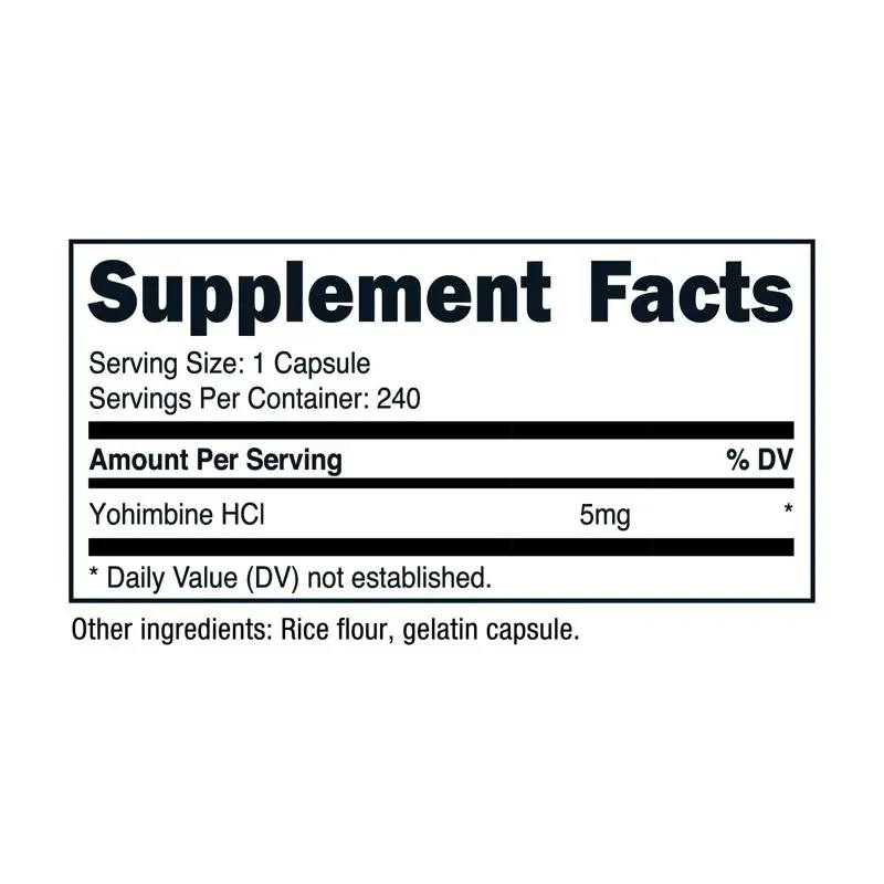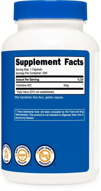 Cada capsula contiene 5 mg de yohimbina HCl y esta respaldada por la garantia de satisfaccion de Nutricost.
