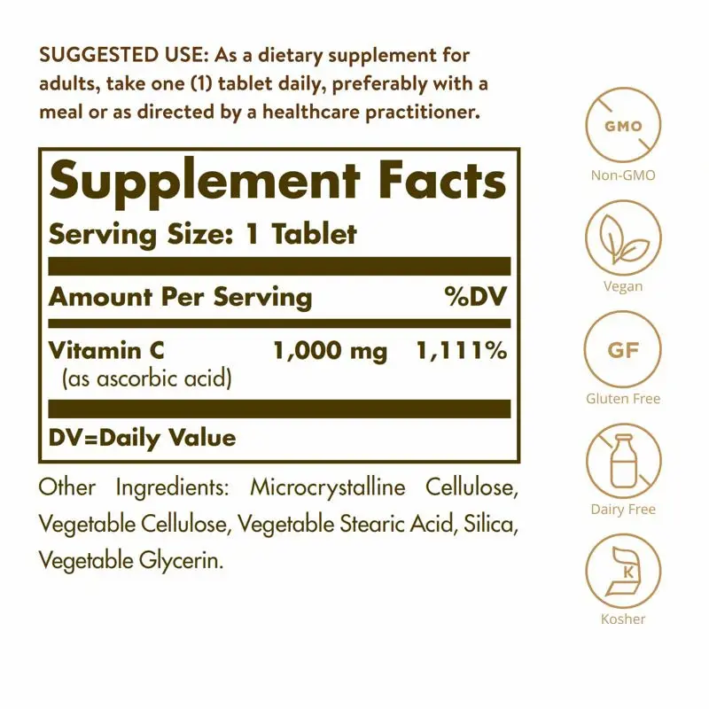- Non-GMO & Gluten Free; Solgar Vitamin C 1000 mg Tablets are non-GMO, kosher, and suitable for vegans; Free of: gluten, wheat, dairy, soy, yeast, sugar, sodium, artificial flavor and sweetener