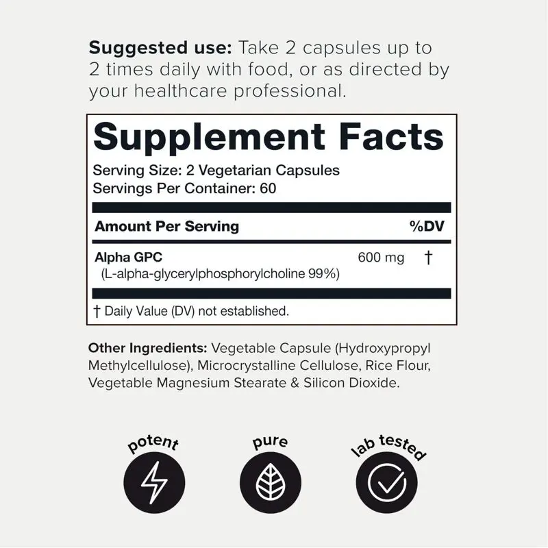 La forma altamente purificada de Alpha GPC: las cápsulas Toniiq Alpha GPC contienen 600 mg de Alpha GPC de la más alta calidad en cada porción. Nuestro Alpha-GPC contiene un nivel de pureza sin precedentes de más del 99% (la mayoría de los productos de alfa GPC y colina contienen menos del 50%).