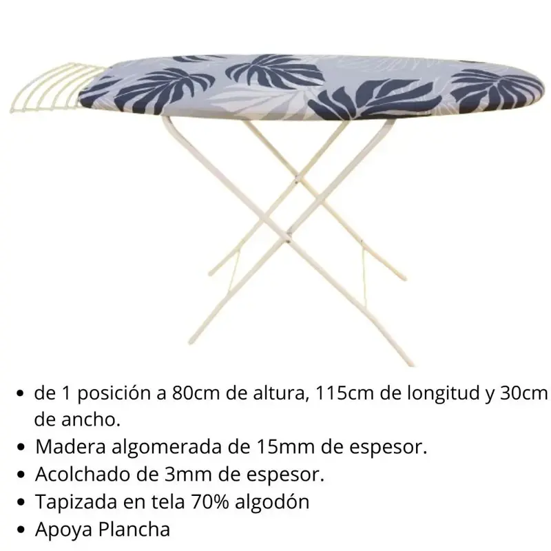 *Medidas:AbiertoAlto 80cmLargo 115cmProfundo: 30cm Cerrado:Alto 120cmLargo 37cmProfundo 4cm- Altura fija de 80cm- Tapizada en tela 70% algodon.- Acolchonado de 5mm de espesor- Apoya plancha rebatible- Patas rebatibles de caño redondo.- Origen: Argentina- Marca: NakanIncluye Apoya Plancha y Tabla retabible. Esta table de planchar combina funcionalidad y practicidad para hacer que la tarea de planchar sea más eficiente y accesible en cualquier hogar.Es plegable y proporciona una superficie estable y acolchada para optimizar el planchado.