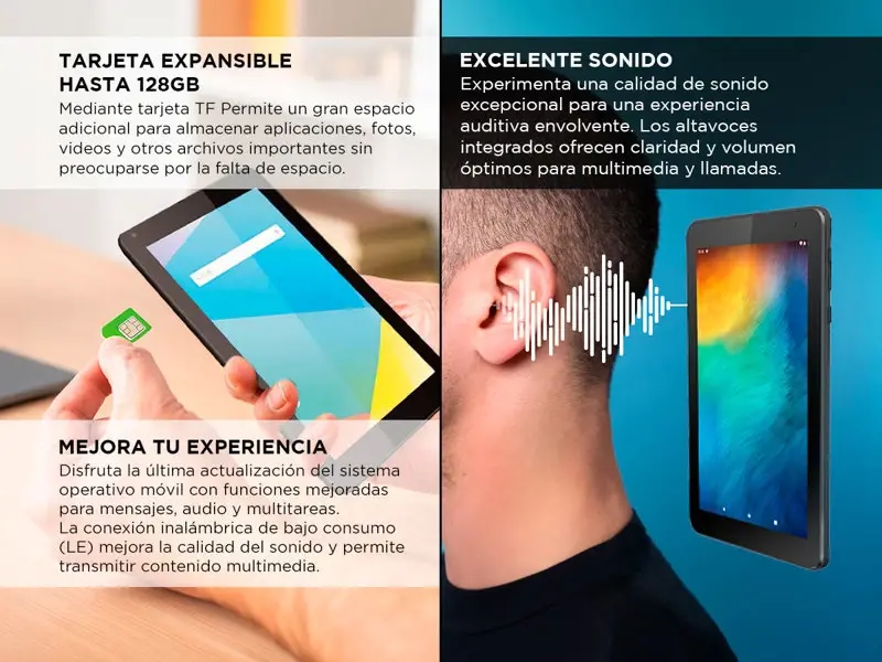 Gadnic presenta la nueva tablet de 7 Pulgadas: Expansión: Almacenamiento extensible hasta 128GB mediante tarjeta TF, permitiendo un gran espacio adicional para almacenar aplicaciones, fotos, videos y otros archivos importantes sin preocuparse por la falta de espacio. Interfaz: Amigable y personalizable, con acceso a millones de aplicaciones en Google Play Store. Conectividad Wi-Fi: Conexiones rápidas y estables. GPS: Preciso para navegación y servicios basados en ubicación. Calidad de Sonido: Excelente sonido para una experiencia auditiva envolvente. Altavoces Integrados, ofrecen claridad y volumen adecuado para multimedia y llamadas. Duración: Prolongada para uso diario sin necesidad de recargas frecuentes Puerto USB: Tipo-C para carga y transferencia de datos rápida. Controles: Botón de encendido y control de volumen accesibles Especificaciones Sistema operativo: Android 13 ROM 32GB RAM 3GB Pantalla de visualización: 7 pulgadas Pantalla táctil con lápiz óptico Cámara frontal: 0.3M Cámara trasera: 2.0MP Bluetooth 5 Expansión de tarjeta T Sí, hasta 128 GB Wi-Fi: Sí Linterna: No Botón lateral: Botón físico x3 (volumen+/volumen-, encendido) Antena RF: Sí, tipo interno Interfaz de auriculares: Salida de línea 2.1 de 3,5 mm con entrada de micrófono (conector de auriculares de 3,5 mm x1) Batería: 3,7 V, 2500 mAh Interfaz USB tipo c Altavoz x1 Soporte de Office MS Office Word, PPT, Excel Acelerador 3D incorporado para juegos. Admite juegos 3D Correo electrónico Gmail, POP3/SMTP/IMAP4 Vídeo (1080P) Admite decodificación de vídeo 1080P FHD (H.265, H.264, MPEG-4, VP8, VP9)