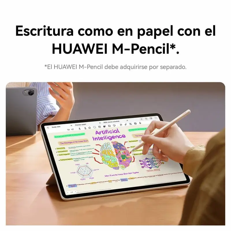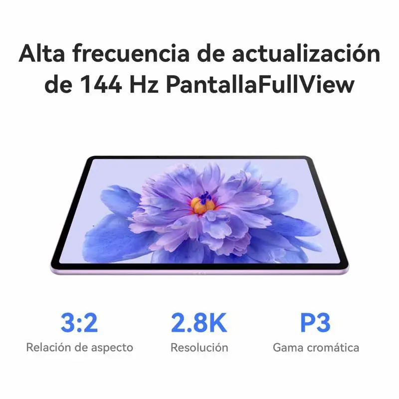Marca Huawei Tamaño Alto 261.0 mm Ancho 177.2 mm Grosor 6.2 mm Peso Aproximadamente 510 g (incluyendo la batería) Tamaño Pantalla 11.5 pulgadas Tipo Pantalla TFT LCD (IPS), frecuencia de actualización de 144 Hz Frecuencia de actualización adaptativa de 30144 Hz Resolución 2800 × 1840 Relación pantalla-cuerpo 87% Brillo 500 nits Color 16.7 millones de colores, amplia gama cromática P3 Pantalla Tactil Multitáctil, admite un máximo de 10 puntos de contacto al tocar Sistema Operativo HarmonyOS 4.2 Memoria RAM: 8 GB ROM: 256 GB Cámara Principal 13 MP (apertura f/1.8, AF) Resolución de imagen de la cámara trasera: 4160 × 3120 pixeles Grabación de video de la cámara trasera: 1920 × 1080 pixeles Modo de captura de la cámara trasera: Belleza/Panorama/Control de audio/Temporizador/Timelapse/Marca de agua/Documentos/Lente AI Cámara Frontal Cámara frontal: 8 MP (apertura f/2,0, FF) Resolución de imagen de la cámara frontal: 3264 × 2448 pixeles Grabación de video de la cámara frontal: 1920 × 1080 pixeles Modo de captura de la cámara frontal: Belleza/Reflejo de espejo/Control de audio/Temporizador/Timelapse/Marca de agua Bateria Capacidad típica 8800 mAh Capacidad nominal 8700 mAh Carga Cargador estándar: Cargador de 10V/2.25A Carga rápida: La tablet admite carga rápida de 10V/2.25A (máx.) y es compatible con la carga rápida de 9V/2A Conectividad Wi-Fi 802.11a/b/g/n/ac/ax, 2 × 2 MIMO Frecuencia WLAN 2.4 GHz y 5 GHz Bluetooth Bluetooth 5.2, soporta BLE, soporta AAC, LDAC Transferencia de archivos Bluetooth Soportado NearLink Soportado Sincronización de datos con la PC Soportado OTG Compatible (corriente de salida máxima 1A/5V durante la alimentación inversa) USB Type-C, USB 3.0 Sensores Sensor de gravedad Giroscopio Sensor óptico ambiental Sensor Hall Micrófonos 2 micrófonos Audio HUAWEI Histen 9.0 Formatos de audio: mp3, mp4, 3gp, ogg, amr, aac, lac, wav, midi Video Formatos de video: mp4, 3gp En la caja Tablet (batería integrada) × 1 Cable USB Type-C × 1 Guía de inicio rápido × 1 Tarjeta de garantía (Depende del mercado) × 1 Teclado x 1