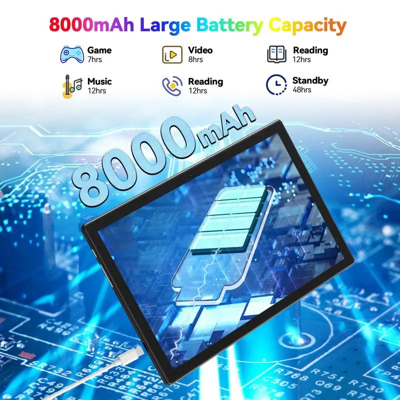 - Mejora la duración de la batería: Esta tableta Android está equipada con una batería que mejora la duración de la batería de 8000 mAh, lo que le proporciona un mayor tiempo de uso, puede ver vídeos hasta 10 horas, jugar hasta 8 horas y escuchar música durante más de 12 horas, lo que le brinda más tiempo de entretenimiento e Internet.