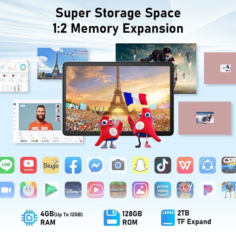 Gran capacidad para multitarea fluida y almacenamiento interno de 128 GB, expandible hasta 1 TB con tarjeta TF. Perfecta para guardar archivos, fotos, apps y juegos.