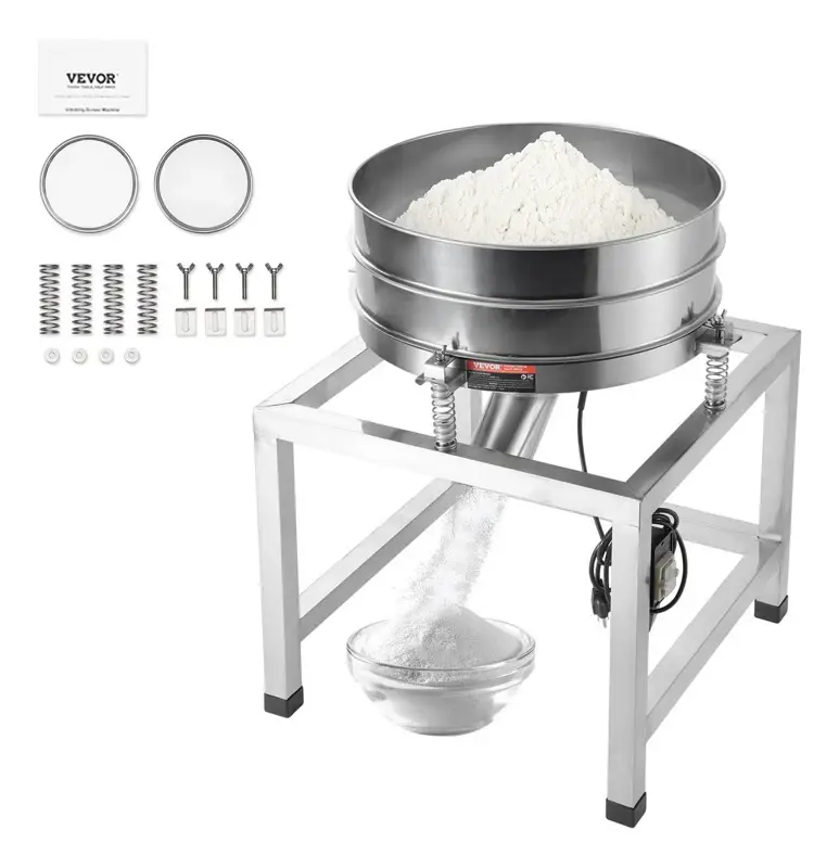 TÍTULO: Tamiz vibratorio eléctrico automático, máquina agitadora de tamiz de acero inoxidable con malla 40+100, máquina tamiz de polvo automática de 25 W con soporte y ruedas, para poderes de harina, DETALLES: Acero inoxidable de alta calidad: El acero inoxidable de alta calidad cuidadosamente seleccionado garantiza durabilidad, seguridad e higiene, por lo que es ideal para condiciones de cribado complejas que involucran polvos y líquidos. La salida redonda de acero inoxidable proporciona una descarga de material uniforme sin obstrucciones, y es fácil conectar varias mangueras. Los ganchos de resorte de acero inoxidable especialmente diseñados ofrecen una excelente elasticidad y una fuerte tensión, evitando eficazmente que el marco del tamiz se caiga o cause ruido anormal. 2 tipos de plata: viene con dos tamices de acero inoxidable 304, malla 40 y malla 100. Puede seleccionar una según sus necesidades: generalmente, una malla 40 es adecuada para la harina, mientras que la malla 100 es ideal para partículas más pequeñas. Ofrecemos una variedad de tamaños de malla para su selección. Aplicaciones versátiles: La base de cuatro patas y las almohadillas de goma garantizan un funcionamiento estable, mientras que el cable de alimentación extendido hace que su trabajo sea más conveniente. Es adecuado para varios entornos y ampliamente utilizado en restaurantes, panaderías, molinos de harina y cocinas caseras. Tamizado de alta eficiencia: equipado con un motor de alto rendimiento que arranca rápidamente y puede funcionar continuamente durante largos períodos, proporcionando un tamizado TABLA DE CARACTERÍSTICAS: Material: Acero inoxidable Color: plateado Estilo: Tamiz de malla 40+100 Dimensiones del producto: 22,6"l. x 22,4"an. x 26,8"al. pulgadas Peso del artículo: 24,25 Libras Se puede lavar en el lavaplatos: No UPC: 1975 Número de modelo del producto: YF005