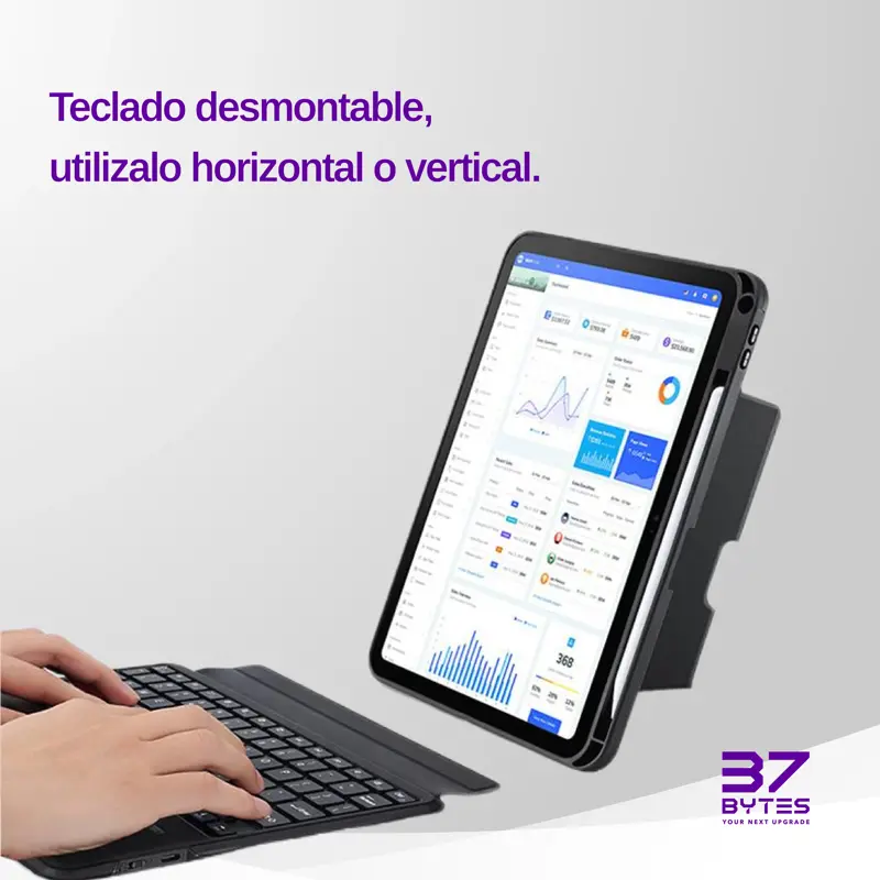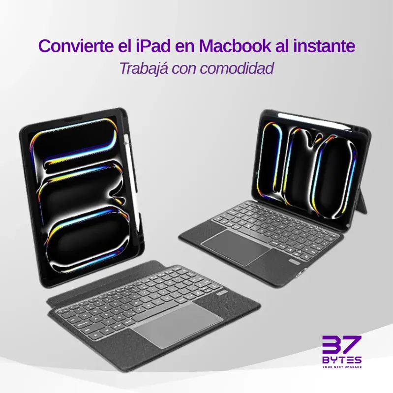 Descripción ¡Lleva la productividad de tu iPad al siguiente nivel! Con la nueva funda con teclado 37 BYTES, transforma tu tablet en una estación de trabajo completa en segundos. Diseñada para quienes buscan versatilidad, esta funda te permite escribir, navegar y diseñar con la misma comodidad que una laptop. ¿Por qué elegir esta funda? ?? Experiencia MacBook al instante: Gracias a su teclado integrado con Trackpad inteligente, puedes usar gestos multitáctiles para navegar de forma rápida y fluida sin tocar la pantalla. ?? Modo Vertical y Horizontal: Su diseño innovador con teclado desmontable te permite separar el teclado y usar la funda como soporte en ambas posiciones. ¡Ideal para leer documentos, hacer videollamadas o ver series! ?? Teclado Magnético Desmontable: ¿No necesitas escribir? Simplemente retira el teclado magnético y usa tu iPad como tablet con una funda protectora ligera y resistente. ?? Soporte para Apple Pencil: Incluye una ranura dedicada para guardar y cargar tu lápiz óptico, asegurando que nunca se pierda y siempre esté listo para crear. Ficha Técnica Diseño y Materiales: Marca: 37 BYTES Tipo de funda: Magnética con soporte (Kickstand) ajustable. Teclado: Desmontable (se adhiere magnéticamente). Touchpad: Sí, integrado (navegación por gestos). Material: Exterior texturizado antideslizante y bordes reforzados antigolpes. Ranura para Lápiz: Sí (Porta Stylus integrado). Conectividad y Batería: Conexión: Bluetooth (sin cables). Carga: Batería recargable vía USB-C. Compatibilidad de uso: Escritura, Dibujo (modo stand), Lectura (modo vertical). Funciones Especiales: Encendido/Apagado automático al abrir o cerrar la tapa (Sleep/Wake function). Teclas de acceso directo (volumen, brillo, control multimedia). Soporte trasero ajustable a múltiples ángulos de visión. ¿Qué incluye la caja? 1x Funda Protectora Magnética 37 BYTES 1x Teclado Bluetooth Desmontable con Trackpad 1x Cable de carga USB-C 1x Manual de usuario (El iPad y el Apple Pencil mostrados en las imágenes son ilustrativos y no están incluidos).