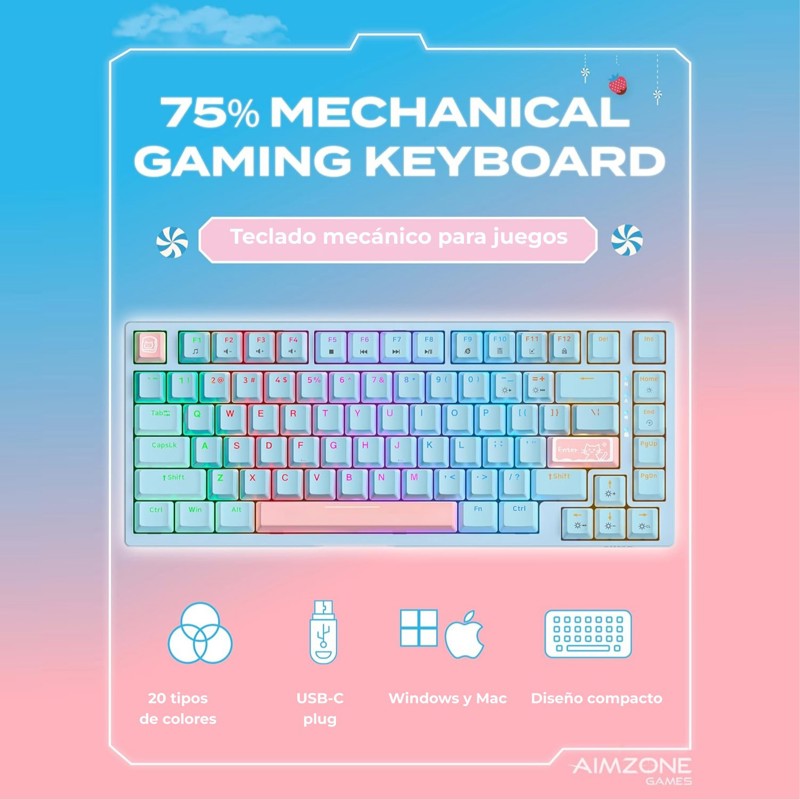 Teclado Mecánico Gamer RGB de 82 TeclasTipo de switch: Tawny (marrón) / Cyan (cian)Interfaz: USB con cableTamaño: Largo 323.5 mm × Ancho 133.5 mm × Alto 42 mm ±0.3 mmPeso: 760 g ±20 gColor: CelesteCompatibilidad: PC, Laptop, Tablet
