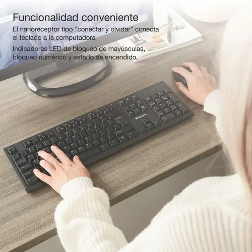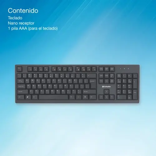 Teclado inalámbrico Verbatim slim receptor USB- 70738 Universalmente compatible Funciona para Windows, MacOS, Chrome OS, Linux Kernel 2.6 y versiones posteriores. Funcionalidad conveniente El nanoreceptor tipo "conectar y olvidar" conecta el teclado a la computadora Indicadores LED de bloqueo de mayúsculas, bloqueo numérico y estado de encendido. Diseño delgado ¡Un compañero ideal para tu PC! Patas inclinables ajustables para mayor comodidad y flexibilidad Rendimiento confiable Conexión inalámbrica de 2,4 GHz para un rendimiento sin retrasos Las teclas de acceso rápido proporcionan acceso instantáneo a los controles multimedia Contenido- Teclado- Nano receptor- 1 pila AAA (para el teclado)