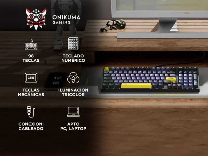 El ONIKUMA G38 destaca por su diseño de 98 teclas, ideal para proporcionar una respuesta táctil precisa y rápida gracias a sus interruptores mecánicos de alta calidad. Su iluminación tricolor crea un ambiente envolvente que te sumerge por completo en la acción, mientras que su construcción ergonómica reduce la fatiga, permitiéndote jugar durante horas sin molestias.