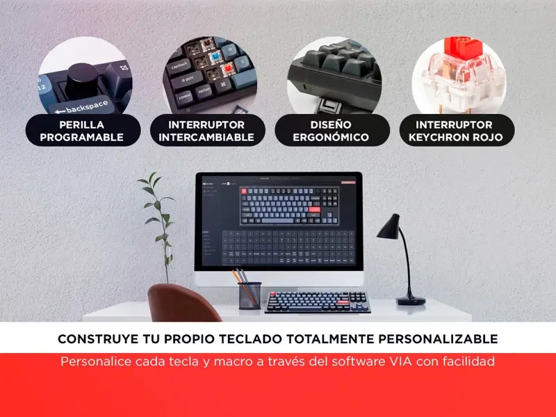 Con una estructura modular totalmente personalizable, el Keychron V3 permite ensamblar cada componente al detalle, desde teclas y switches hasta placas y perillas. El sistema intercambiable en caliente es compatible con la mayoría de interruptores mecánicos MX de 3 y 5 pines, incluidos Cherry, Gateron, Kailh y Panda, lo que elimina la necesidad de soldadura. Incluye interruptores rojos lineales prelubricados que proporcionan una respuesta táctil sin igual, con una vida útil de hasta 50 millones de pulsaciones.
