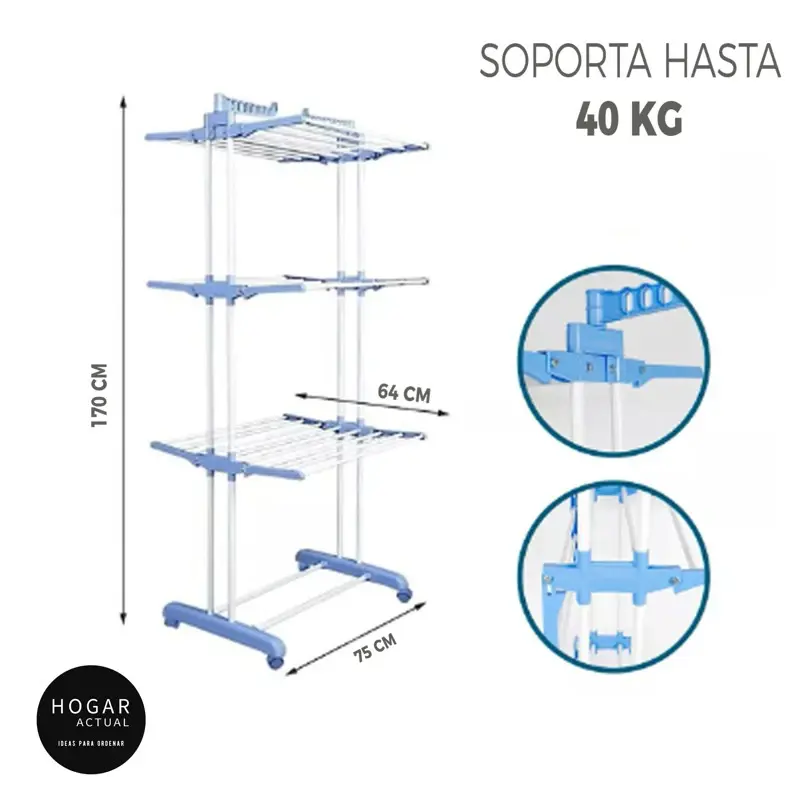 HOGAR ACTUAL TENDER VERTICAL REFORZADO CON RUEDAS 3 NIVELESSKU: 142958Características:• Reforzado de caño pintado blanco y plástico celeste.• Incluye 2 barras laterales plásticas o perchero, ideales para colgar camisas y prendas pequeñas.• Su gran tamaño supera los tender convencionales y es ideales para espacios reducidos.• Posee en su base cuatro ruedas c/freno, lo que permite un fácil deslizamiento.• Materiales duraderos: plástico reforzado y caño pintado.• Fácil de armar y trasportar• Fácil Instalación• MEDIDAS:- Alto: 170cm- Ancho: 70cm- Prof: 65cm- Base: 40x70cm- Brazo: 30cm