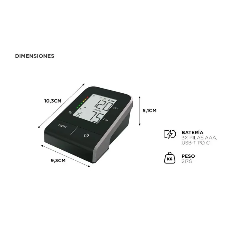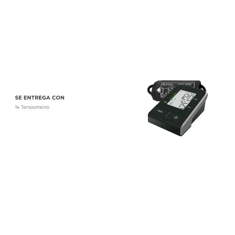 Este dispositivo avanzado cuenta con una pantalla LCD de fácil lectura y presurización automática, asegurando que cada medición sea rápida y precisa. Utilizando el método oscilométrico, este tensiómetro detecta latidos cardíacos irregulares y proporciona un indicador de clasificación de la OMS para facilitar la interpretación de los resultados. Entre sus funciones destacadas, el tensiómetro promedia las últimas tres pruebas, detecta la batería baja, y cuenta con apagado automático para conservar energía. Además, incorpora retroiluminación y función de voz para una experiencia de uso más cómoda. Con un amplio rango de medición, cubre presiones sistólicas de 60-260 mmHg, diastólicas de 40-200 mmHg, y pulsos de 30-180 latidos por minuto, con una precisión de +/- 3 mmHg para presión y +/- 5% para pulso. Ideal para quienes buscan un monitoreo constante y confiable de su salud cardiovascular, este tensiómetro es la herramienta perfecta para tu hogar. Especificaciones Automático: Si Pantalla LCD: Si Presurización automática: Si Método de Medición: Método oscilométrico Funciones: Detección de latidos cardíacos irregulares, indicador de clasificación de la OMS, promedio de las últimas 3 pruebas, detección de batería baja, apagado automático, voz, retroiluminación Rango de medición: