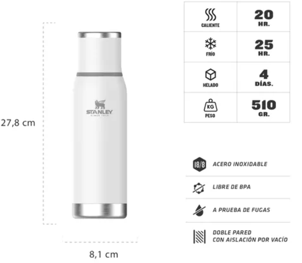 TERMO STANLEY ADVENTURE TO-GO 750ML ORIGINAL TAPÓN CEBADOR10-12210-001 - POLAR10-12210-002 - CLAY10-12210-003 - CHARCOALLa botella Adventure To-Go tiene un diseño moderno y un rendimiento duradero. Aislados y a prueba de fugas, estos nuevos elementos esenciales deberían permanecer a tu lado día tras día. Diseñado para los días de trabajo, de vacaciones y todos los días, esta próxima generación es más liviana, delgada y elegante que nunca. La botella para llevar cuenta con una amplia abertura para facilitar la limpieza, perfecta para el viajero ocupado. Mantén tus bebidas favoritas calientes durante 20 horas o frías durante 25 horas con el aislamiento al vacío de doble pared de Stanley. La tapa aislada de acero inoxidable puede funcionar como una taza para beber mientras viaja. Desliza esta botella en tu mochila o bolso de viaje para tomar té, café o agua caliente de camino a tu destino.ESPECIFICACIONES:- Peso: 510gr.- Alto: 27cm- Diámetro: 8cmCARACTERÍSTICAS:- Mantiene 20Hs- Mantiene 25Hs Frio- Aptos para el lavavajillas.- Acero inoxidable 18/8.- Aislamiento de doble pared al vacío.- Libre de BPA.