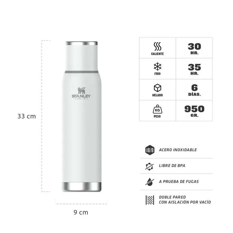 Termo Stanley Adventure To - Go 1.3lts Polar C/tapón CebadorLlévalo al trabajo, llévalo de vacaciones, a tu lugar secreto para surfear, llévalo donde quiera que vayas. La botella Adventure To-Go es perfecta para llevar tus bebidas frías o calientes favoritas, manteniéndolas a la temperatura ideal durante horas. Fácil de empacar o transportar gracias a su diseño moderno y aerodinámico, es a prueba de fugas y fácil de confiar dado el rendimiento legendario de Stanley. La tapa aislada también es una taza para beber fácilmente y el tapón vertedor proporciona un vertido suave.