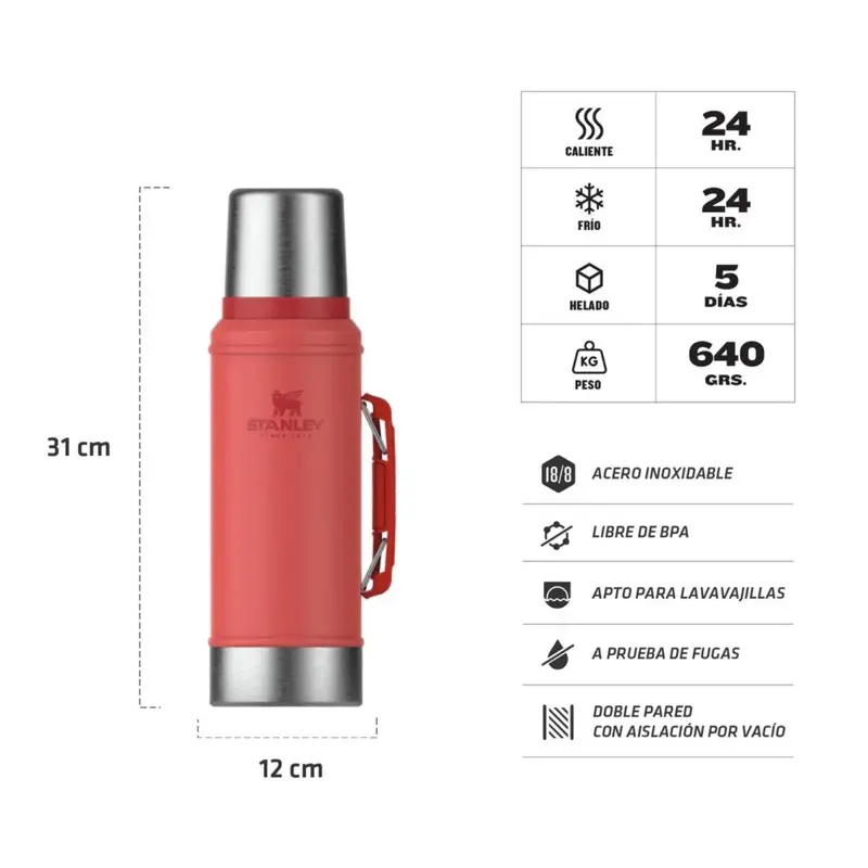 El Termo Mate Stanley Classic 950 ml con Asa y tapon cebador es un producto icónico que ha acompañado a los aventureros al aire libre en Argentina durante generaciones. Este clásico termo Stanley de 1L ha sido una parte integral de la vida de muchas personas, permitiéndoles disfrutar de bebidas calientes y frías mientras crean recuerdos inolvidables. Con su construcción robusta y aislamiento al vacío, este termo puede manejar cualquier situación y mantener tus bebidas a la temperatura deseada durante 24 horas. Su tapón giratorio permite un vertido suave y la tapa aislada también sirve como taza para beber. El Termo Mate Stanley Classic 950 ml con Asa y tapon cebador es lo suficientemente delgado como para sostenerlo con una mano, lo que lo convierte en el compañero perfecto para tus aventuras al aire libre. No te pierdas la oportunidad de disfrutar de la calidad y el rendimiento legendario del termo Stanley en Argentina, con Asa y tapon cebador.ESPECIFICACIONESSeries: ClassicCapacidad: 950 mlMantiene Caliente: 24 hrsMantiene Frio: 24 hrsMantiene Helado: 5 dias