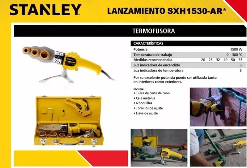 > STANLEY KIT TERMOFUSORA 1500W + 6 BOQUILLAS 20-25-32-40-50-63 + TIJERA + CAJA DE METAL (SXH1530-AR) - Cód: RCET0009