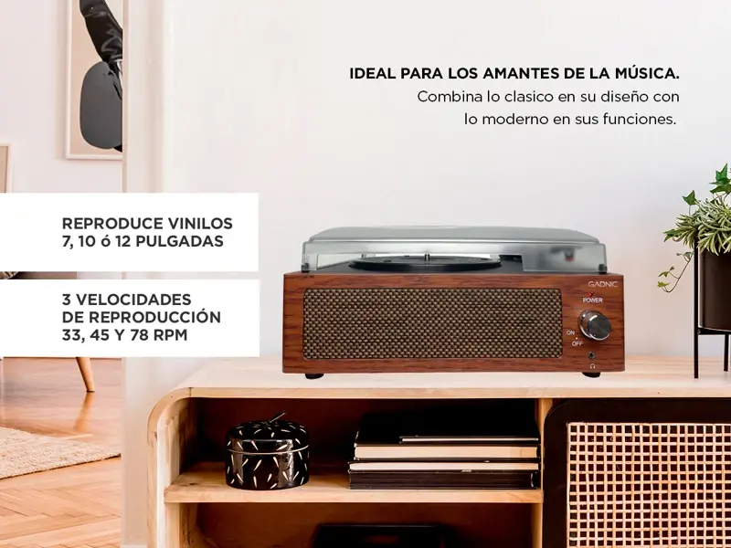 El tocadiscos Gadnic combina lo clasico en su diseño con lo moderno en sus funciones, ideal para los amantes de la música.