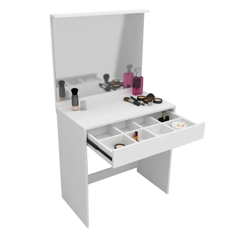 Mesa con Espejo y cajón para diversos usos como, tocador, maquillador, costurero, escritorio, mesa de trabajo o usos múltiples. El cajón tiene un divisor interno opcional.