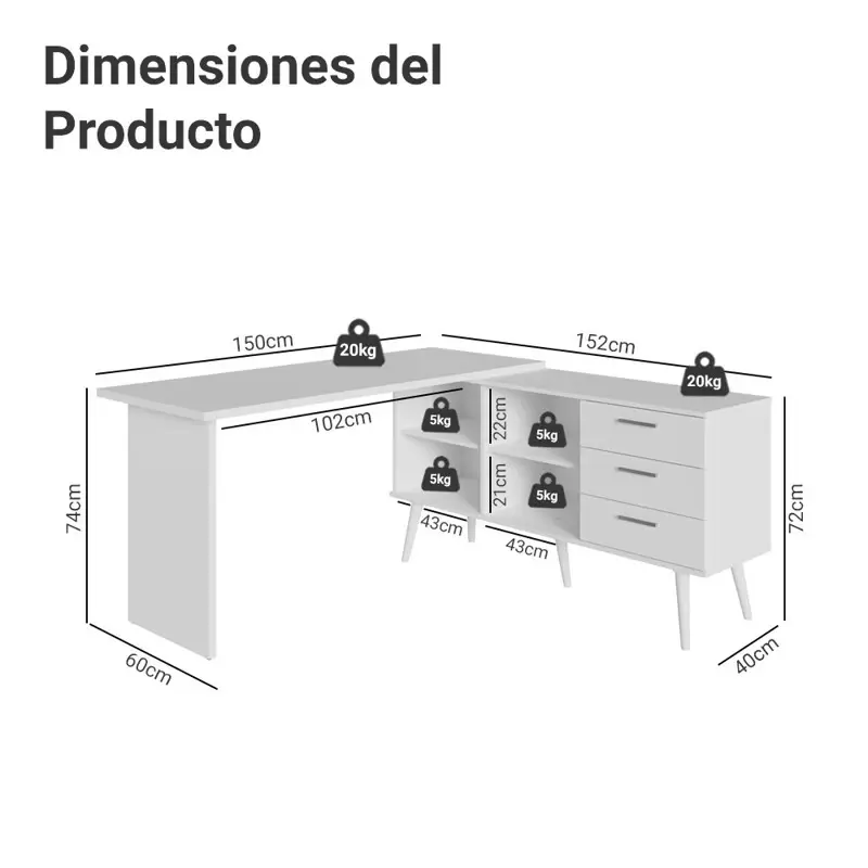 Medidas del mueble: En L: 74 cm de altura x 150 cm por un lado x 152 cm por el otro.