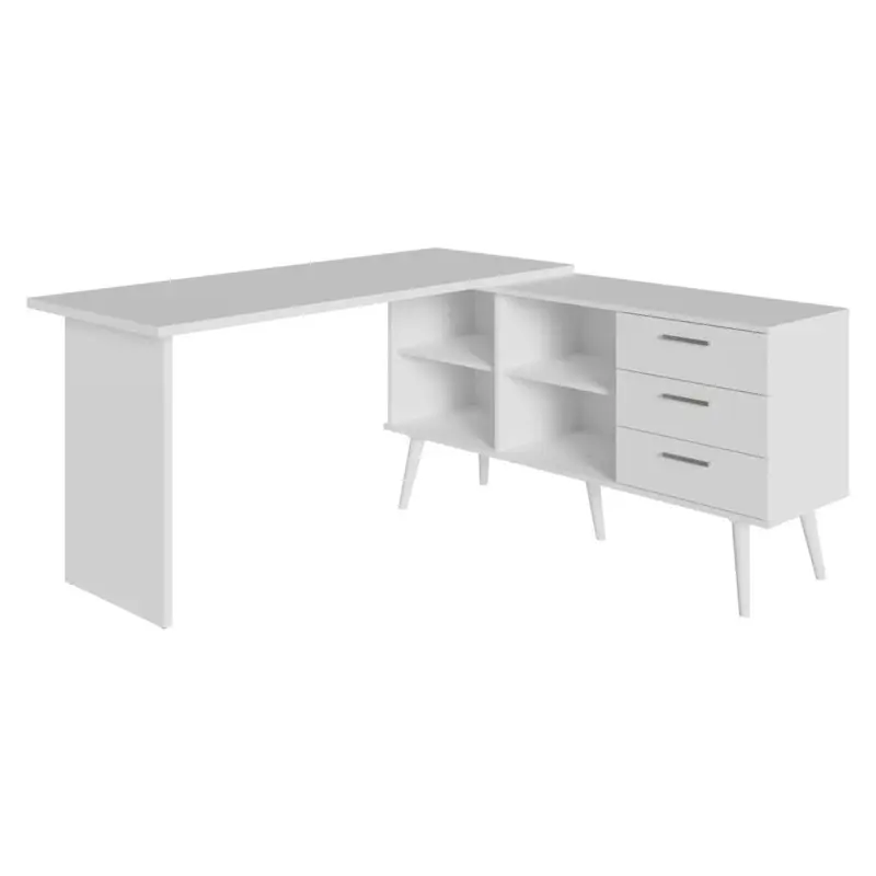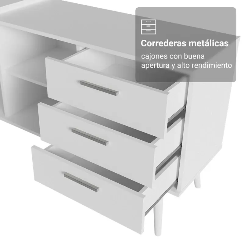 Compuesto por una mesa amplia y un mueble lateral interconectado con tres (3) cajones espaciosos y cuatro (4) nichos abiertos, ideal para guardar maquillajes, libros, cuadernos o artículos decorativos. Con un diseño de esquina inteligente, optimiza el espacio y puede ser utilizado tanto como tocador como escritorio, perfecto para quienes buscan funcionalidad y un toque de estilo en el ambiente.