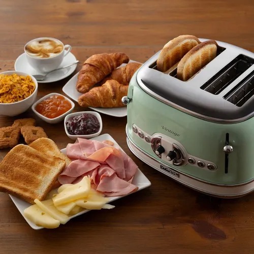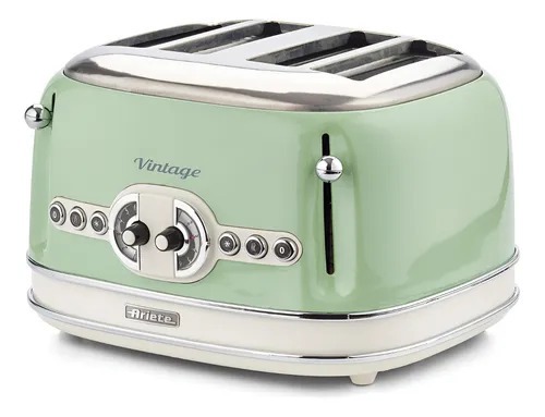 TOSTADORA ARIETE 4 PANES VINTAGE 156 VERDE 1600 W Marca:Ariete Código: PA-TO156VE El gran tamaño de esta tostadora (32 cm largo x 29 cm ancho x 30,5 cm altura) la convierte en un elemento de decoración perfecto para la cocina. La tostadora eléctrica Vintage cuenta con 4 ranuras, con controles separados para cada par de rebanadas de pan, para tostar las rebanadas de pan en 6 niveles de tostado diferentes. Cuando la tostada está lista, la función de expulsión automática te permite sacar la rebanada de pan de forma segura. La bandeja recogemigas extraíble garantiza una limpieza fácil y el compartimento inferior para el cable te permite ahorrar espacio. La tostadora Vintage presenta un diseño robusto: las paredes exteriores de acero inoxidable en colores pastel la convierten en un objeto único e inconfundible en el panorama de los pequeños electrodomésticos de cocina. Ariete fabrica productos icónicos y funcionales: la línea Vintage combina el diseño italiano con la facilidad de uso que es el sello distintivo de Ariete, empresa italiana líder en tostadoras para uso doméstico. Potencia 1600 W Control de corte 2x2 rebanadas 6 niveles de tostado Bandejas recogemigas extraíbles Función de autocentrado Expulsión automática de rebanadas Recogedor de cable Patas antideslizantes Longitud del producto: 32 cm Ancho del producto: 29,00 cm Alto del producto: 20,50 cm Peso del producto: 2,22 kg Peso de la caja: 3,35 kg- Marca: Ariete- Modelo: 156- Color: Verde- Voltaje: 220 V- Potencia: 1600 W- Capacidad de rodajas: 4- Cantidad de niveles: 6- Funciones: Tostar- IVA: 21 %- Impuesto interno: 0 %- Sku: PA-TO156VE- EAN: 8003705114944- GTIN: 8003705114944