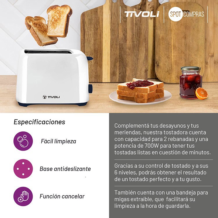 Tostadora Eléctrica Tivoli 700w 6 Niveles Doble Ranura TST-207B y TST-207N.Complementá tus desayunos y tus meriendas, nuestra tostadora cuenta con capacidad para 2 rebanadas y una potencia de 700W para tener tus tostadas listas en cuestión de minutos.Gracias a su control de tostado y a sus 6 niveles, podrás obtener el resultado de un tostado perfecto y a tu gusto.También cuenta con una bandeja para migas extraíble, que facilitará su limpieza a la hora de guardarla.Especificaciones:* Marca: Tivoli.* Tipo: Tostadora.* Medidas: 16,8cm x 14,5cm x 25cm.* Color: Negro y blanco.* Incluye: 1 unidad.