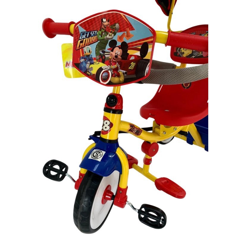 Triciclo personajes Disney con manija direccional y barral de contención desmontables para cuando son más grandes!Asiento con respaldo, giratorio 360º y foto del personaje.Capota europea plegable. Apoyapiés rebatible. Ruedas de goma eva.Canasto portaobjetos.Edad de uso: Desde los 3 años hasta los 5 añosKilos soportados: hasta 25kgMedidas: Alto 96cm / Ancho 48cm / Largo 93cmPeso: 6 kg