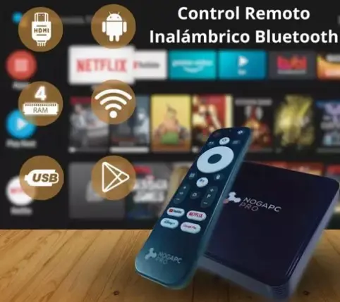 El NogaPc Pro es un dispositivo compacto que transforma tu televisor en un centro de entretenimiento inteligente. Posee sistema Android 12, ofrece una amplia gama de aplicaciones y funciones. Su control remoto con Bluetooth te permite navegar y buscar contenido con comandos de voz, y el indicador LED te mantiene informado sobre su estado. Conéctalo a tu TV a través de HDMI y disfruta de películas, series, música y mucho más desde la comodidad de tu sofá.