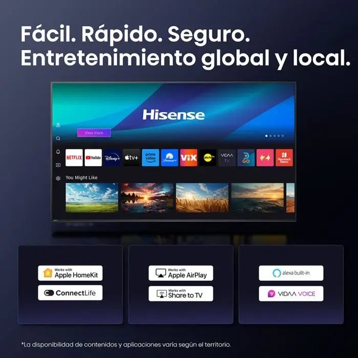 - 2025): Imagen y Pantalla: Tecnología QLED (Quantum Dot) con resolución 4K UHD (\(3840\times 2160\)). Incluye escalador de imagen IA y soporte para Dolby Vision, HDR10, HDR10+ y HLG.Diseño: Pantalla casi sin bordes (bezel-less) con un tamaño de 43 pulgadas (109 cm).Sistema Operativo y Smart TV: Sistema VIDAA (desarrollado por Hisense), conocido por su velocidad, con acceso a aplicaciones como Netflix, YouTube, Prime Video y Disney+. Compatible con control por voz (Alexa/Google Assistant).Rendimiento y Juegos: Tasa de refresco de 60 Hz nativos, potenciada con Game Mode Plus para una experiencia fluida.Conectividad: 3 puertos HDMI 2.1 (o 2.0 según región/modelo), 2 puertos USB, Wi-Fi de doble banda (2.4/5 GHz), Bluetooth 5.3 y salida de audio óptica.Sonido: Soporte para Dolby Atmos y potencia de altavoces, habitualmente ajustada para habitaciones medianas/pequeñas. Somos FREE CONNECTION!