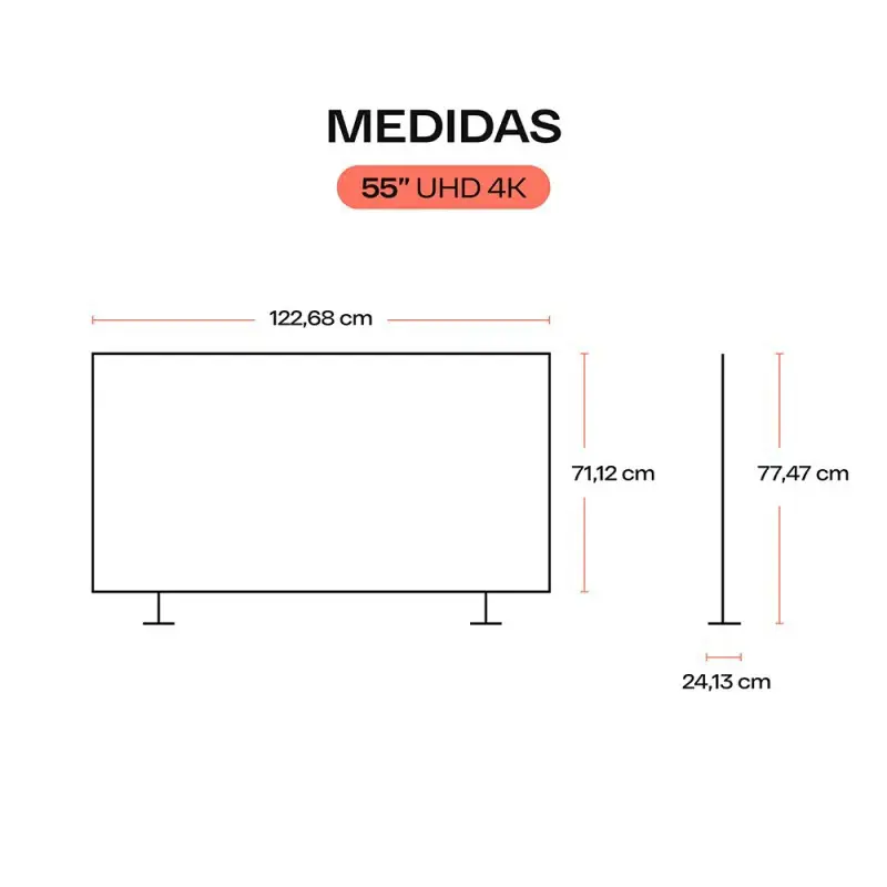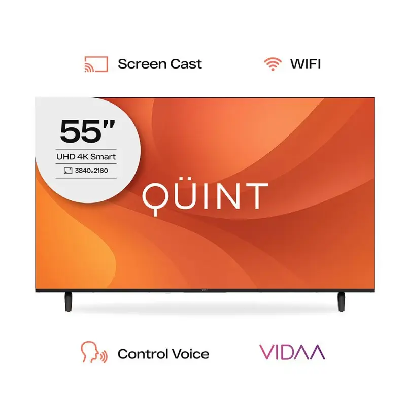 TV LED SMT 55P UHD QT4 55 VIDAA QÜINT- Tamaño de pantalla: 55"- Resolución: 3840P2160- Tipo de resolución: UHD- Smart TV: SI- Formato de pantalla: plano- Sistema operativo: VIDAA- Memoria: 2G DDR + 16G EMMC- Entradas HDMI: 3- Entradas USB: 2- Control remoto: SI- Navegador: SI- Control Voice: SI- WIFI: SI- Dimensiones:- Medidas VESA: 300 x 100- Peso: 15.7 Kgs- Ancho: 123.61 cm- Alto: 71.8 cm- Alto(con base): 77.2 cm- Profundidad: 9 cm- Profundidad (con base): 26.9 cm- Garantía fabricante 12 meses- Origen Argentina