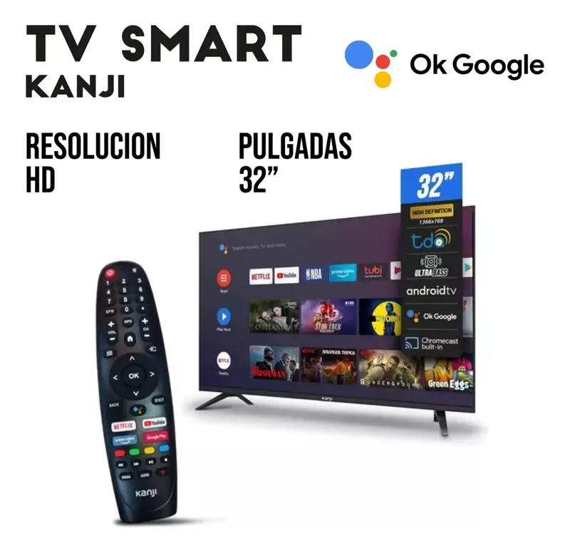 DESCRIPCION:La Smart Tv Kanji 40 Kj-40st005-2 Hd Google TV ofrece una resolución HD para una visualización óptima. Viene equipada con aplicaciones populares como Netflix y YouTube, y funciona con el sistema operativo Android TV. Para una mayor conectividad, cuenta con 3 puertos HDMI y 2 puertos USB.Sus dimensiones son 88.26cm de ancho, 51.3cm de alto y 7.9cm de profundidad. Este dispositivo proporciona entretenimiento y conectividad en un mismo lugar.