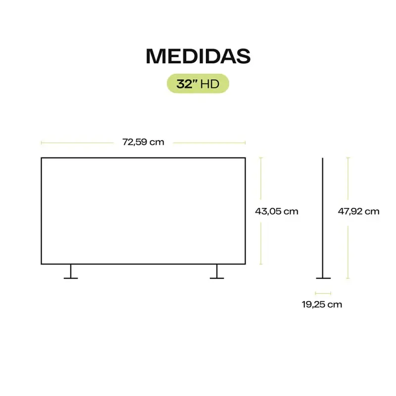 La pantalla de 32" ofrece imagen en alta definición con panel LED y procesamiento que mejora contraste y nitidez, ideal para ver series, noticias y videojuegos casuales en salas, dormitorios o cocinas; los colores se presentan vivos y el movimiento se mantiene fluido para contenidos deportivos o cine.