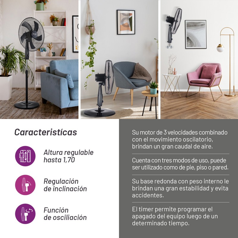 Práctico y versátil, este modelo de ventilador 3 en 1 permite adaptarse a cualquier necesidad ya que fácilmente se convierte en un ventilador de piso o ventilador de pared.