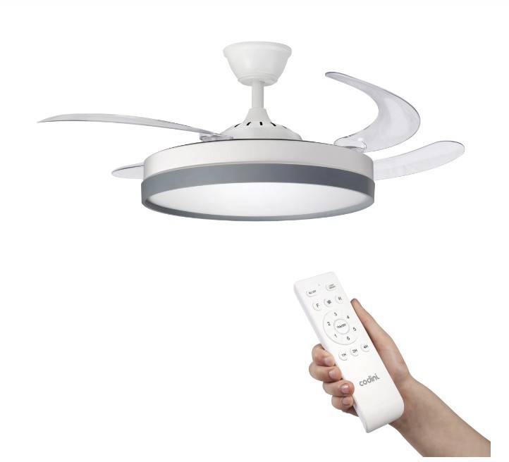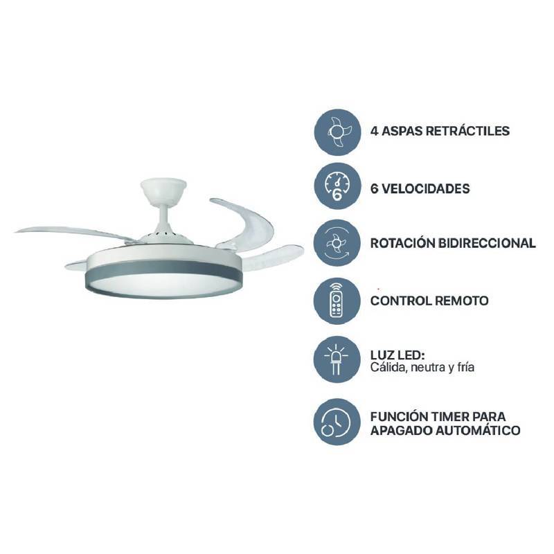 Presentamos el nuevo ventilador de techo Premium.Con su revolucionario sistema de fácil instalación y su sistema de aspas retráctiles, se ofrece la combinación ideal de funcionalidad, tecnología y diseño moderno.-Sistema de 4 Aspas con Función Retráctil y Función Reverso-6 velocidades-Luz led integrada de 60w (2x30w) y selector de Temperatura (Fría-Neutra-Cálida)-Función Timer: 1,2,4 y 8hs.-Control remoto para todas sus funciones-Diámetro de la luz: 500mm