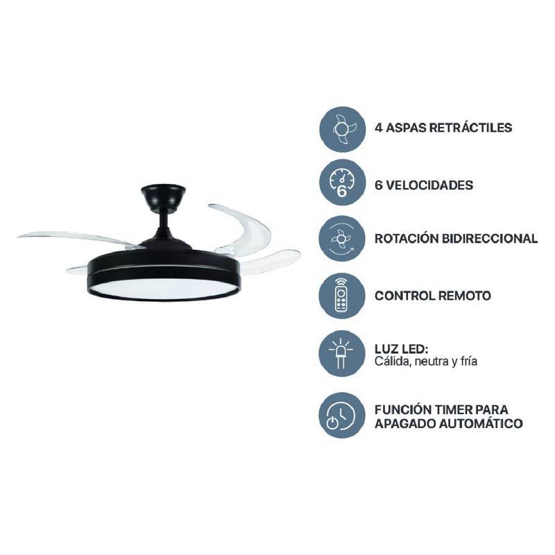 Presentamos el nuevo ventilador de techo Premium.Con su revolucionario sistema de fácil instalación y su sistema de aspas retráctiles, se ofrece la combinación ideal de funcionalidad, tecnología y diseño moderno.-Sistema de 4 Aspas con Función Retráctil y Función Reverso-6 velocidades-Luz led integrada de 60w (2x30w) y selector de Temperatura (Fría-Neutra-Cálida)-Función Timer: 1,2 y 4 hs.-Control remoto para todas sus funciones-Diámetro de la luz: 500mm12 meses de garantía directo de fábrica.