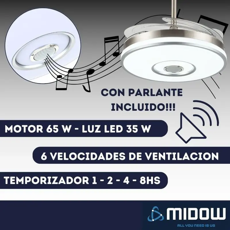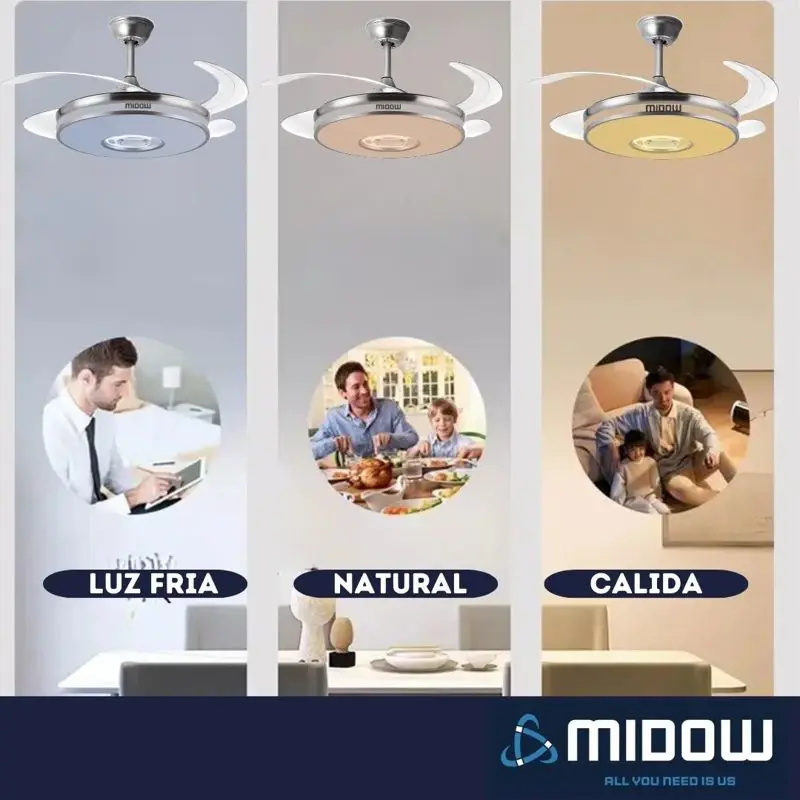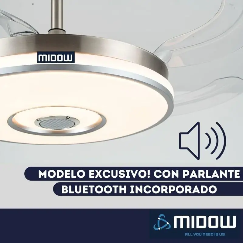 El ventilador retráctil MIDOW con PARLANTE, con modo brisa combina la funcionalidad de un ventilador de techo tradicional con la estética moderna de una lámpara colgante.