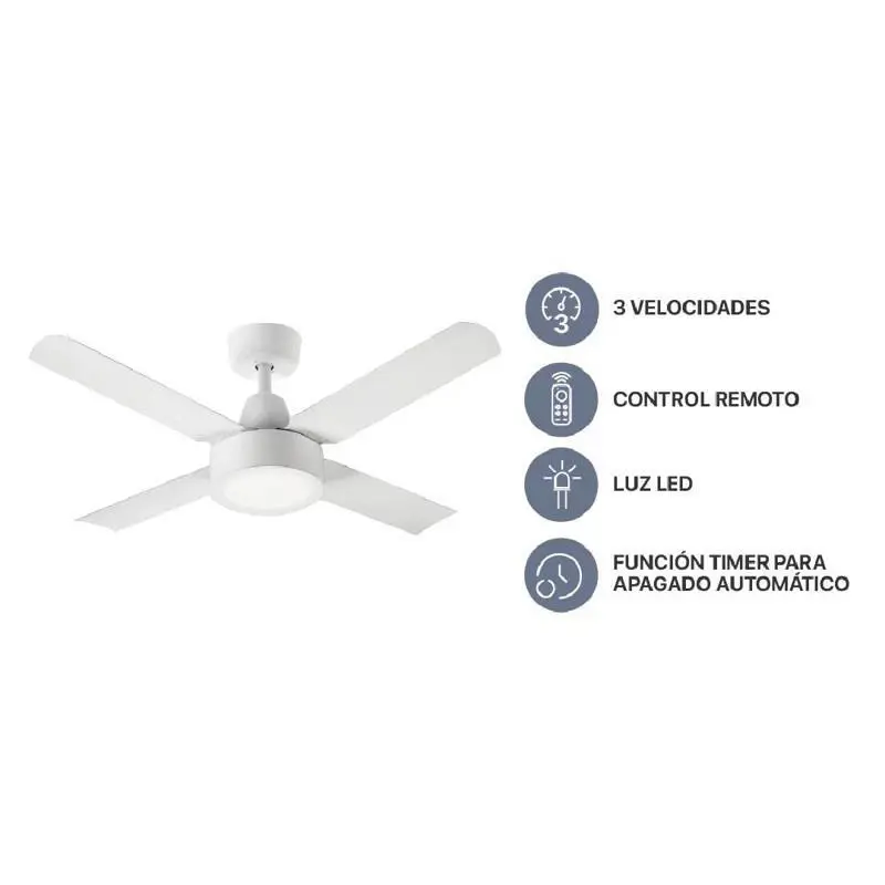 NUEVO MODELO V5RBVentilador de techo Premium Revolucionario sistema de fácil instalación Luminaria LED 22cm de diámetro- Luz Neutra 3 velocidadesControl remotoTimer en 1, 2, 4 y 8hs Encendido/ Apagado tanto de luces como de motor4 palas de chapaColor Blanco Peso: 7kgs